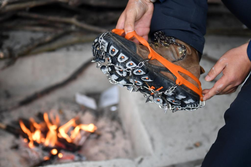 12月19日,尹斌在110千伏西公线003号监测哨所休息后穿上冰爪。