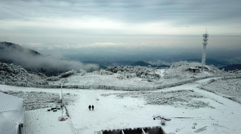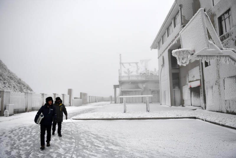 12月19日,尹斌(前)和龙昱君在110千伏西公线003号监测哨所观测覆冰情况后返回。