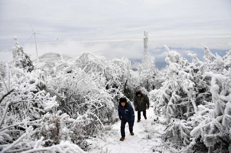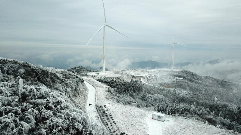 12月18日,尹斌(左)和龙昱君观测覆冰情况后返回西晃山风电场。