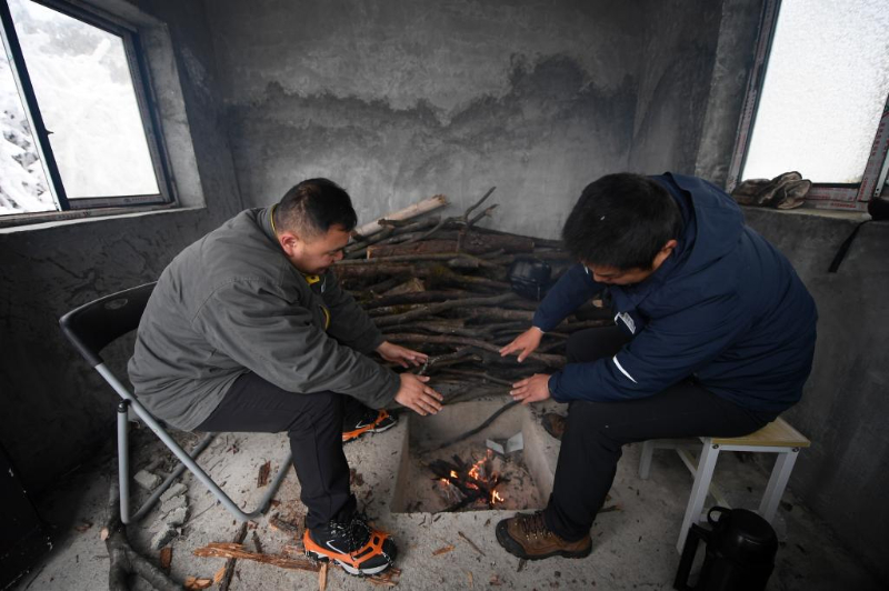 12月19日,尹斌(右)和龙昱君在110千伏西公线003号监测哨所休息。这座水泥小屋在2020年修建,以便输电运检工观测融冰时休息。