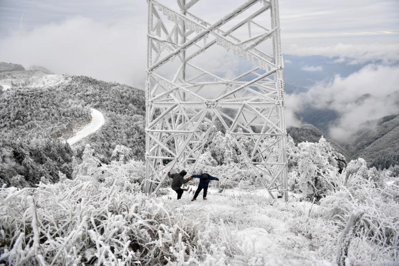 12月19日,尹斌(右)和龙昱君在110千伏西公线003号监测哨所观测铁塔覆冰情况后返回。