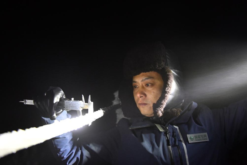 12月18日夜间,尹斌在110千伏西公线001号监视哨所用游标卡尺测量导线覆冰厚度。