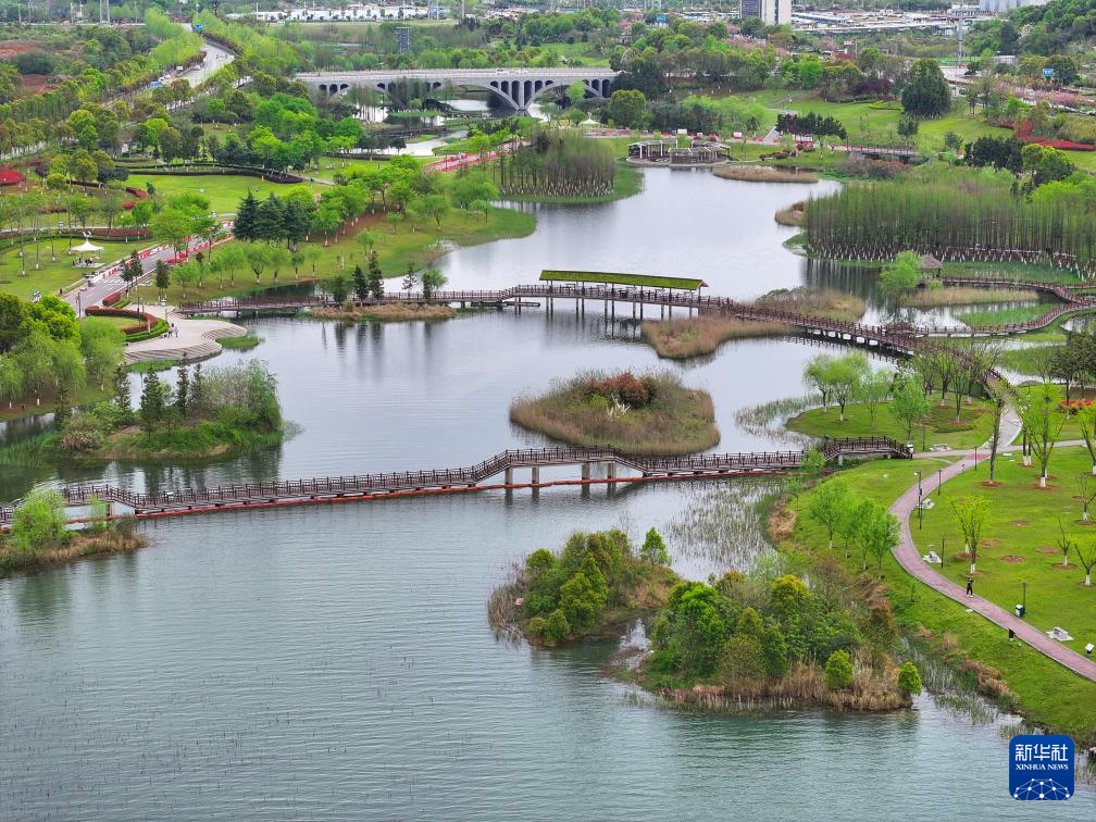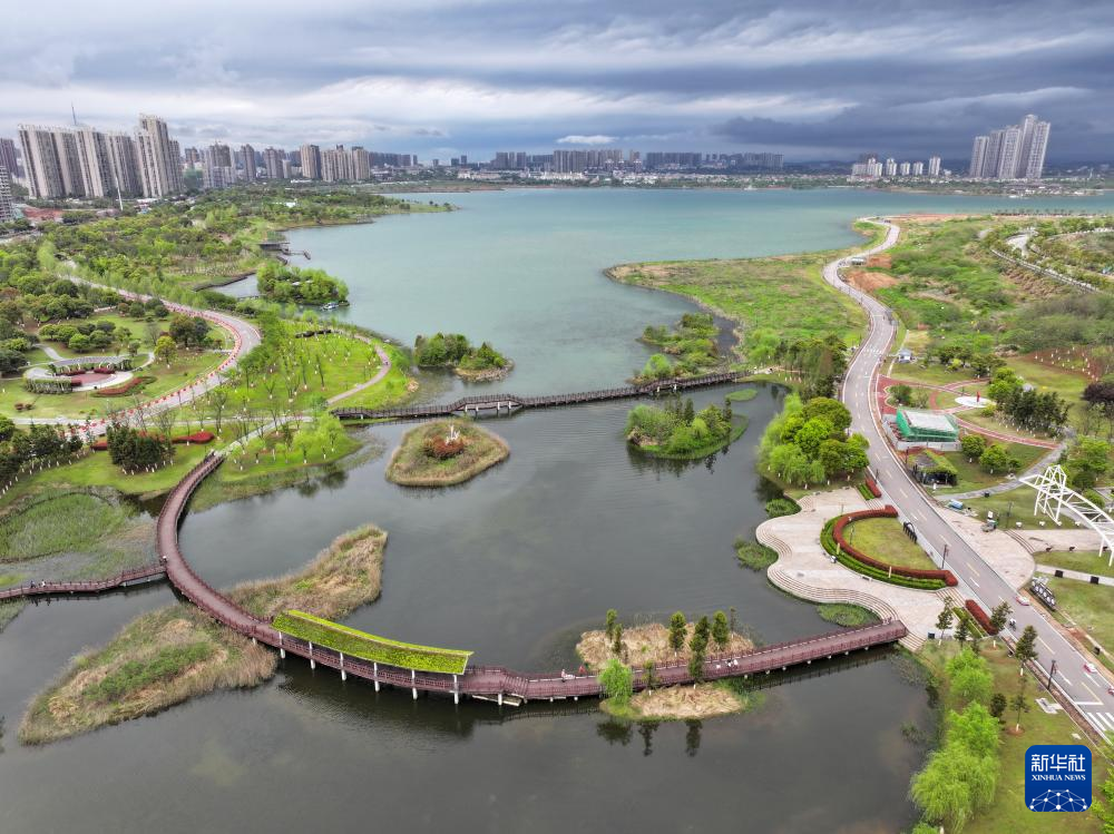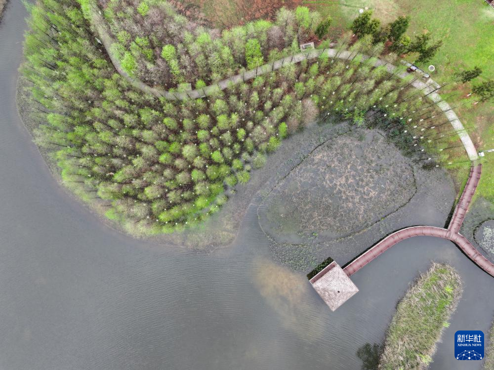 4月2日拍摄的湖南松雅湖国家湿地公园一角(无人机照片)。
