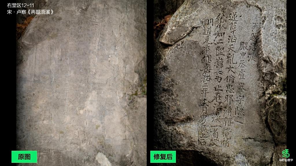 浯溪摩崖石刻修复前(左)与修复后(右)。(马栏山文化数字化创新中心供图)