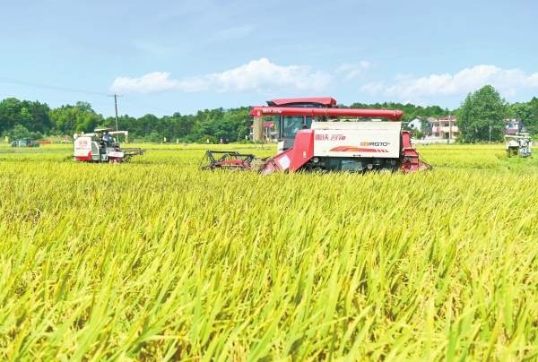 洞口县花古街道七里村,农机手驾驶收割机收割早稻。滕治中 摄(湖南图片库)