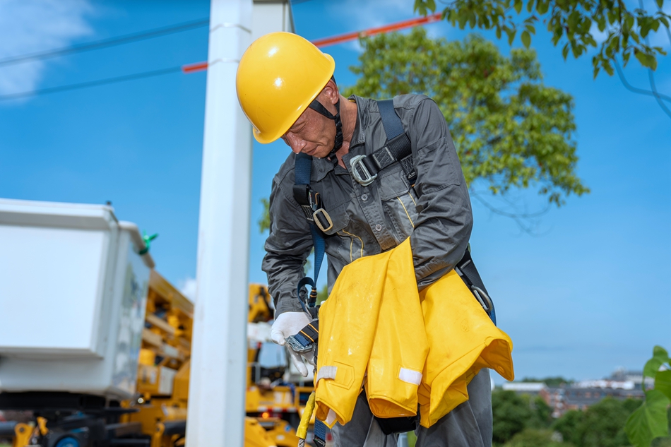 7月9日下午15:46,长沙带电作业配网不停电作业二班配网不停电作业人员从线路上下来浑身已湿透。巫宇龙 摄