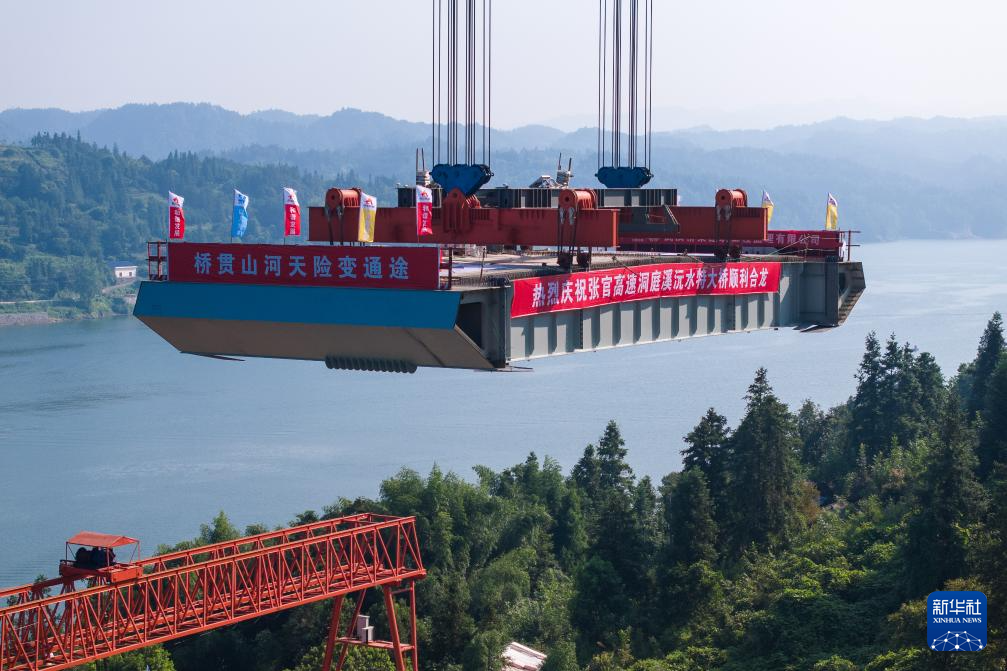 8月3日,在张官高速洞庭溪沅水特大桥施工现场,一块钢混结合梁在被缓缓提升(无人机照片)。