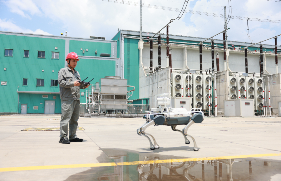 在±800千伏特高压韶山换流站内,运维人员正在操作机器狗进行设备巡视,确保站内设备安全稳定运行。国网湖南电力 供图