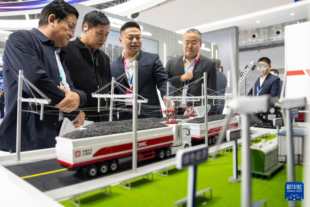 11月7日,工作人员(左三)在株洲国际会展中心为观众介绍电气化公路运输系统。新华社记者 陈思汗 摄pagebreak